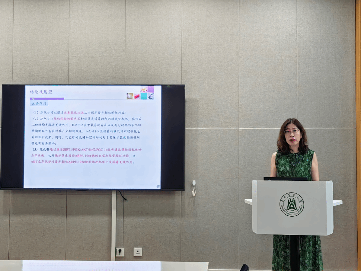 教师李春美教授分享了花青素在改善蓝光所致眼损伤及其分子机制方面的最新研究成果,该研究为开发 “护眼功能食品” 提供了科学依据,也与董诺教授团队关注的“眼表氧化损伤修复”形成跨领域呼应。