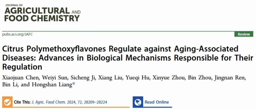 2024年12月11日,华中农业大学李斌教授团队梁宏闪副教授课题组在国际食品Top期刊《Journal of Agricultural and Food Chemistry》(Q1,IF=5.7)发表题为“Citrus Polymethoxyflavones Regulate against Aging-Associated Diseases: Advances in Biological Mechanisms Responsible for Their Regulation”的综述论文,2024年12月25日被选为封面论文。