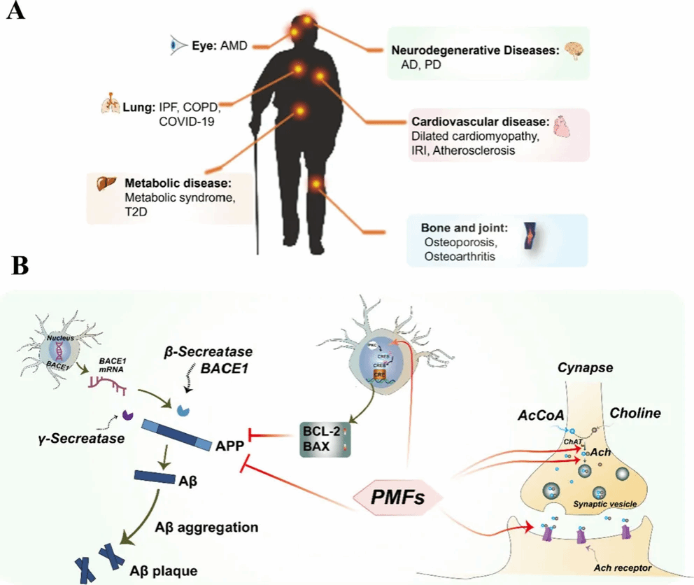 Figure 3. (A) Schematic representation partially of the age-related diseases described grouped by organs or systems.  (B) Neuroprotective effects of PMFs and related molecular mechanisms by inhibiting the activities of BACE1, promoting CREB phosphorylated levels and ChAT gene transcription, enhancing the level of ACh and the activity of nAChR.