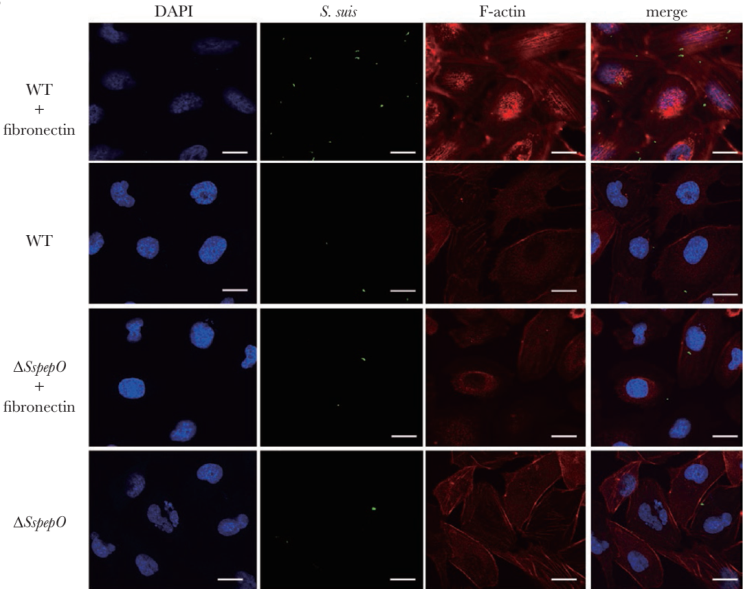 该研究首先通过基因工程的方法,构建了致病因子(SsPepO)的基因缺失缺失株,在细胞模型中证明该致病因子与猪链球菌粘附人脑微血管内皮细胞密切相关。该粘附过程在添加外源人纤维蛋白原(Fibronectin)的情况下可以得到增强。通过小鼠模型,进一步证明猪链球菌可借助该致病因子影响血脑屏障的通透性。随后,进一步研究确定了猪链球菌通过内皮素转化酶(SsPepO),可以通过与人纤维蛋白原特异性结合,形成蛋白质复合物SsPepO-Fibronectin-integrin,促进细菌穿过血脑屏障从而引起宿主脑膜炎的分子机制。该研究为猪链球菌病的治疗提供了新型的治疗靶点、为防治猪链球菌病乃至其他致脑膜炎细菌提供新的思路。