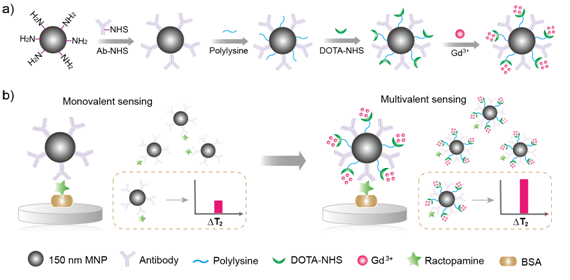兽药残留是食品安全中主要的问题之一。过量使用的兽药会通过食物链在人体内富集,产生细菌耐药性、组织器官病变等健康问题。例如,莱克多巴胺的累积超过一定量时,易发生毒副反应,出现心动过速、恶心晕眩、肌肉疼痛等中毒症状,严重者甚至会危及生命。虽然包括我国在内的全球多个国家均已制定了针对兽药残留的限量标准,但兽药残留超标现象仍屡见不鲜,对人体健康存在巨大的威胁。现有的仪器分析法、免疫分析等虽然具有一定的优点,但在成本、灵敏度、检测成本、分析效率等方面或多或少存在一定的局限性。磁弛豫免疫传感器是一种新型的多学科交叉的分析技术,虽然传统的磁弛豫免疫传感器在分析性能上较上述方法有一定提高,但其灵敏度、稳定性等尚存在提升的空间。基于此,陈翊平教授课题组组装了多重信号放大的磁纳米探针,并在此基础上构建了集磁分离与磁传感于一体的磁弛豫免疫生物传感器,用于猪尿液中莱克多巴胺的快速高灵敏分析。