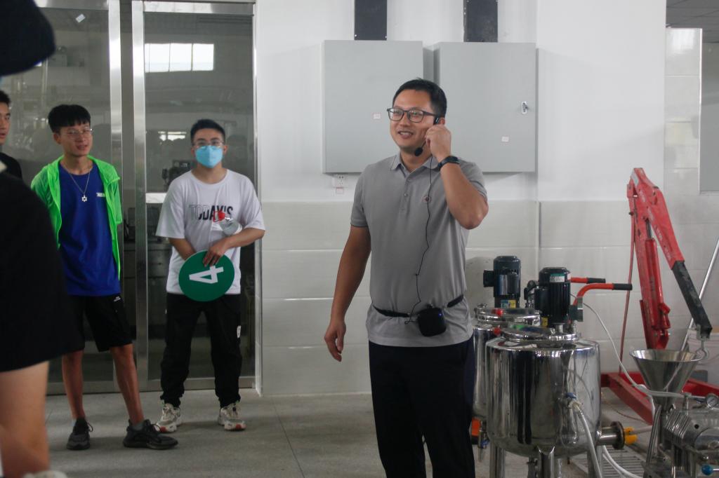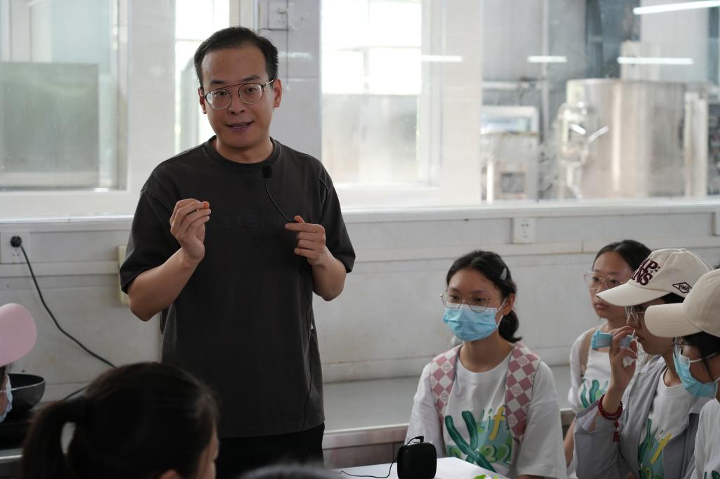 尹涛老师依据两条中试生产线介绍了水产品加工和粮油加工。现场提问同学“水产品/粮食类有哪些”,老师与学生现场互动增加了知识趣味性。随后他详细介绍从鱼皮鱼鳞里面经酶解、脱色、脱盐、喷雾干燥得到胶原蛋白钛的过程。盛龙老师则通过蛋制品生产线的介绍,让同学们了解到鸡蛋不仅可以保留原始状态加工,还可以打破重新组建,蛋壳中富含钙元素,生产机钙产品。
