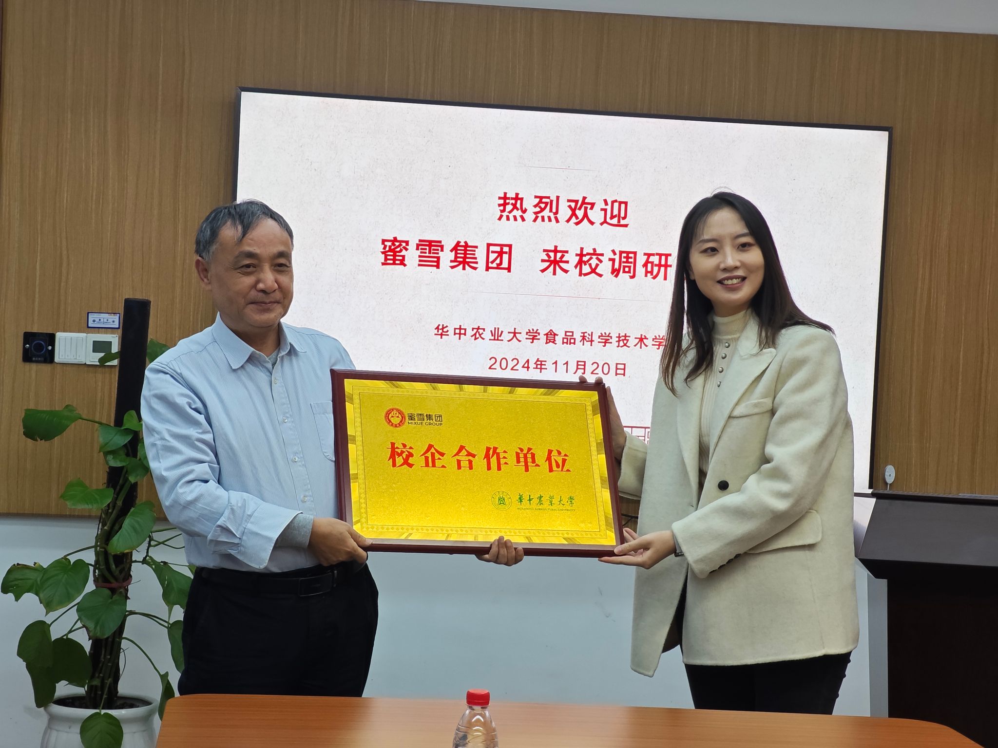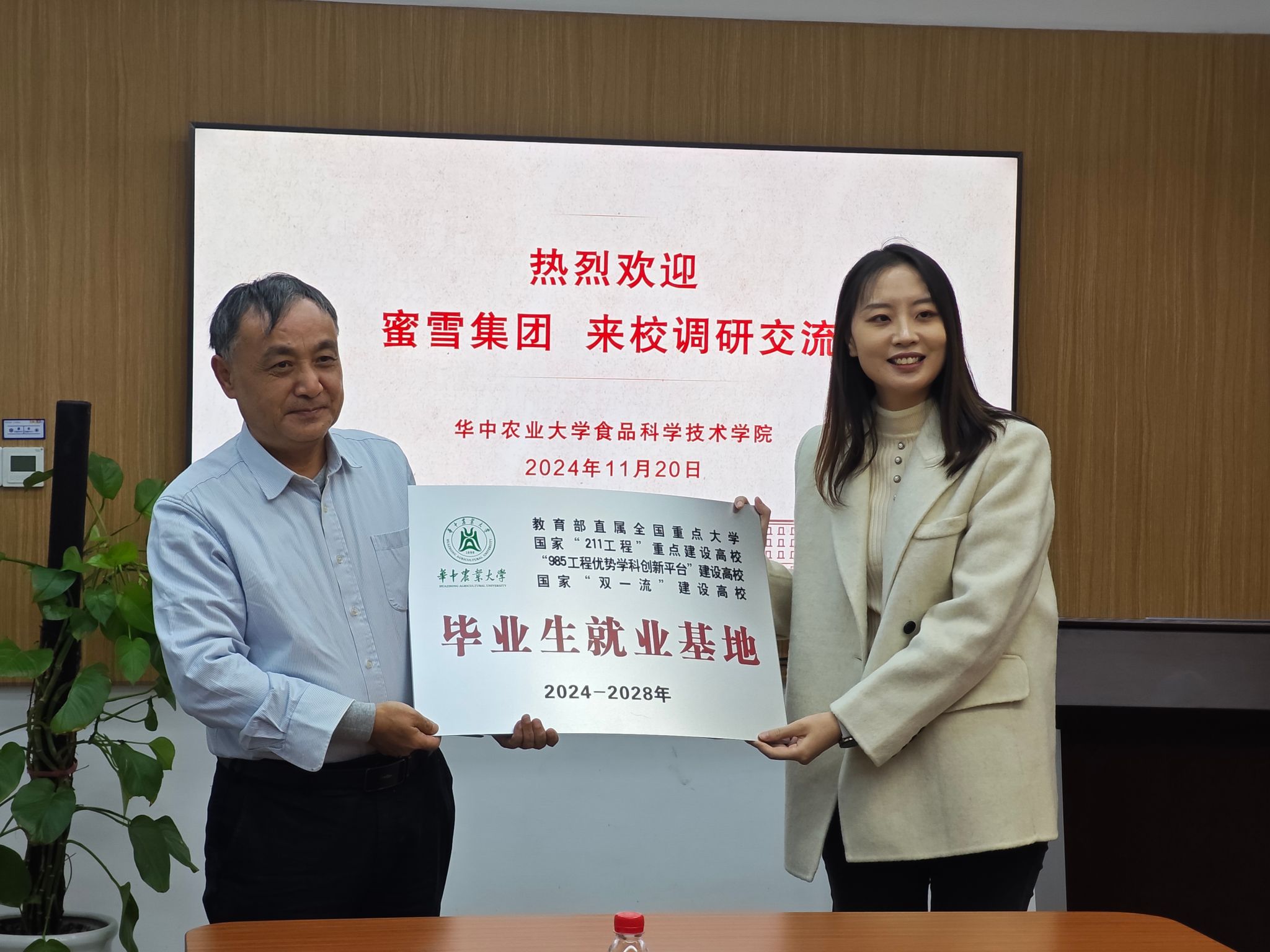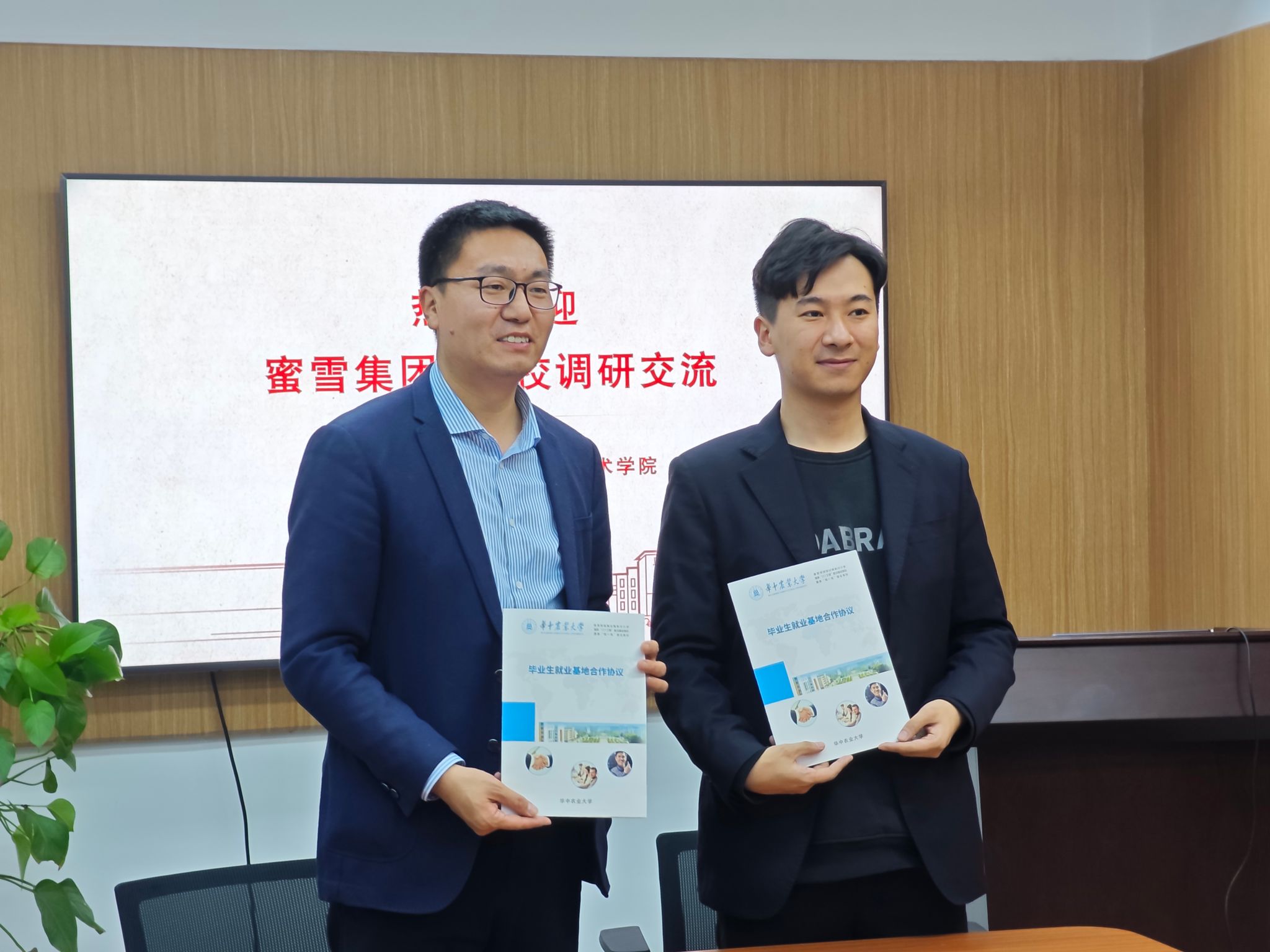 党委副书记吕瑞凯与蜜雪集团校招负责人陈冠龙签订就业基地协议书,党委书记杨铁贵向蜜雪集团人才供应部负责人吴菲菲授牌。