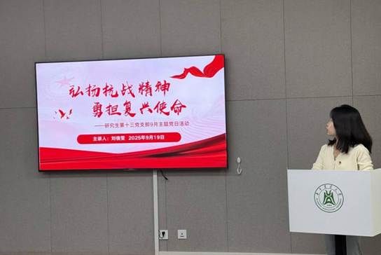 研究生第十三党支部在工科楼122会议室组织召开了9月主题党日活动。本次活动以“弘扬抗战精神,勇担复兴使命”为主题,通过集中学习、交流研讨等形式,进一步增强了全体党员的历史使命感与政治责任感。活动由党支部书记刘倩雯同志主持。