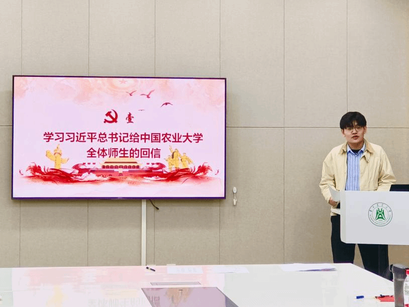会议伊始,支部成员在苑祥昊同志带领下认真学习了习近平总书记给中国农业大学全体师生的回信。习近平总书记回信勉励中国农业大学师生、指引强农报国方向、寄予农业高校殷切期望,彰显了党中央对深化农科改革、强化科技创新、培育时代新人的战略部署。党员同志应牢记习近平总书记回信要求,矢志强农报国,努力推动中国农业基础更加稳固、农村地区更加繁荣,为建设农业强国、推进中国式现代化作出新的贡献。