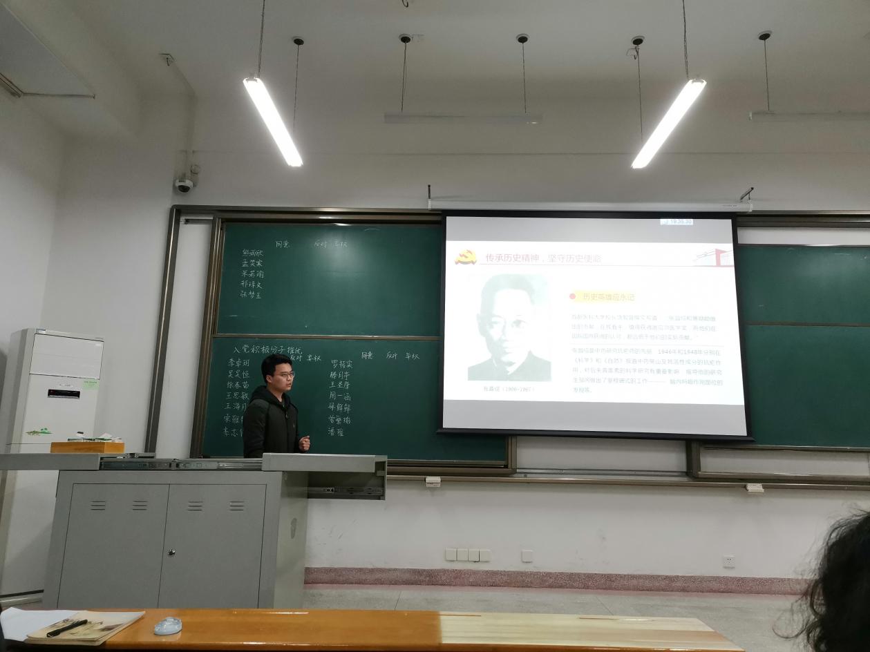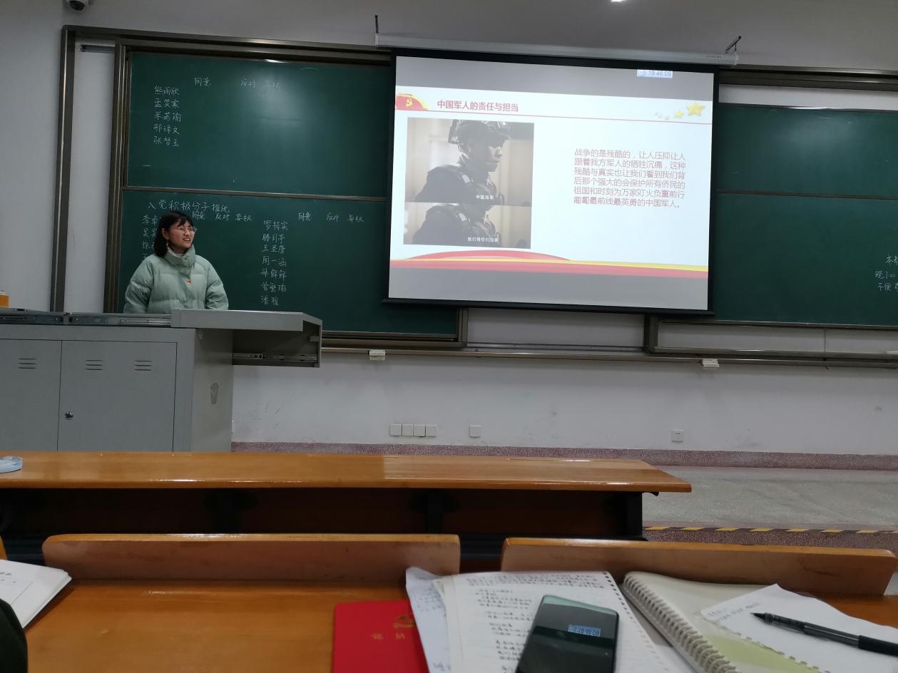 在四史的学习分享中,支部成员鄢新力以“改革开放下的中国”,谈观看《红海行动》的感想。支部成员骆浩宇向大家分享了寒假期间他“重庆白公馆、渣滓洞之行”的深切感受,他说:“新时代的我们遇到困境时,应有先烈的勇气与毅力去面对。了解历史,就是拓宽视野,从而不断地学习与改进。”此外,在观看纪录片《筑梦路上》后,针对“四史”学习教育,他强调到:“不能为了学习而学习、为完成任务而学习,而要在坚持正确历史观的基础上,学会历史思维、培养历史视野、增强历史担当。”