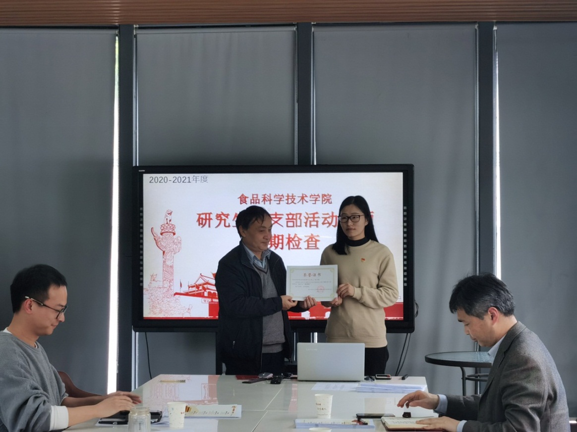 最终根据交流分享的结果,将优秀奖颁发给此次立项活动中期检查表现最佳的研究生第五支部和第一支部,杨铁贵书记和熊善柏老师分别为第五支部和第一支部颁发优秀奖证书。