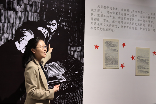 团委书记、辅导员胡小娱担任本次参观的导览,向同学们讲述着一幅幅版画背后那难忘的动人故事与红色精神。