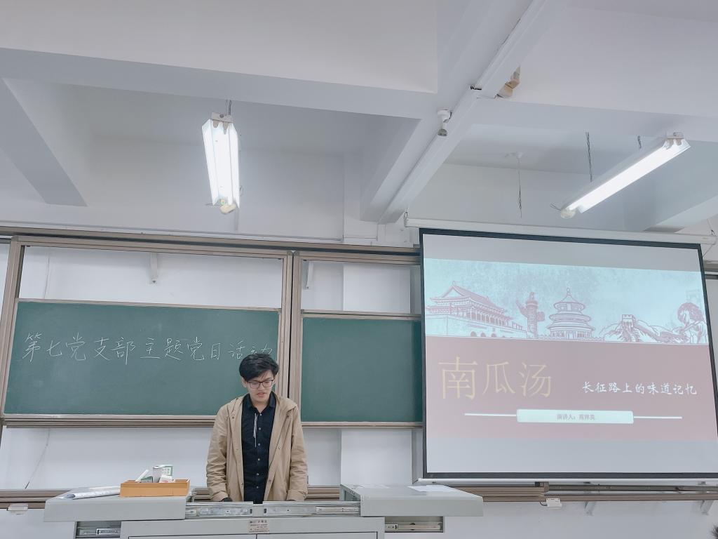 会议第一项,由副书记黄云飞主持支部内微党课评比,各参赛人以“长征路上的红色食品”为主题,选取长征路上的其中一个城市的红色背景食品作为分享内容,讲述食品背后的故事与意义。黄云飞以百草汤为例,讲述了红军战士过草地时,只能吃牛肚子里未消化的草根为食的艰苦岁月。