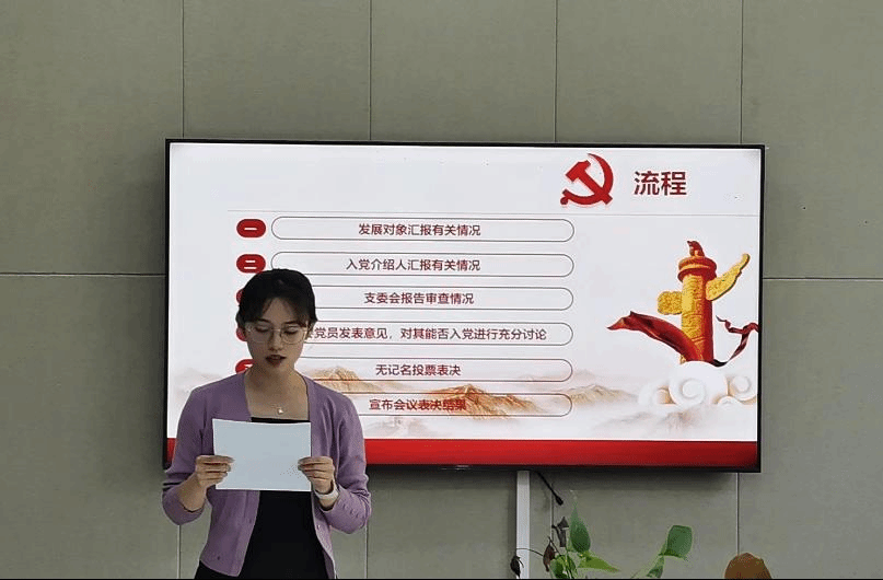 会议第四项,接收发展对象为预备党员。发展对象郑晓雪就自身情况向党组织作汇报,并向党组织表明其入党动机,入党介绍人及支部委员会报告发展对象培养期间相关情况,随后与会党员充分讨论并就是否同意接受郑晓雪为中共预备党员发表意见。最终,经支部无记名投票表决,同意接收郑晓雪同志为中共预备党员,由组织委员盛丽为其颁发党徽及《党员手册》。至此,雷速篮球
