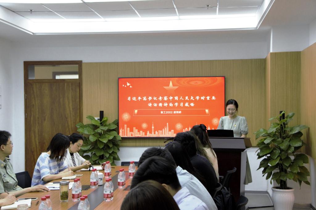 研究生第七党支部沈路虹同志在分享自己对习近平总书记在中国人民大学考察时的重要讲话精神时说道:“作为一名研究生,既要有家国情怀,也要有人类关怀。热爱祖国才是立身之本,成才之基,我们要把习主席的寄语转化为食品人发展的动力。”作为本科生团员代表的凌雨峤同学在听完习主席的讲话后感慨道:“这个美好的时代造就了一批批优秀的青年,这样的华夏盛世也成就了无数青年人的梦想!新时代的中国青年,自信昂扬,努力拼搏,踔厉奋发,勇毅前进。”作为青年学子,我们认真落实习主席对于广大青年的谆谆教诲,砥砺前行,不负韶华!