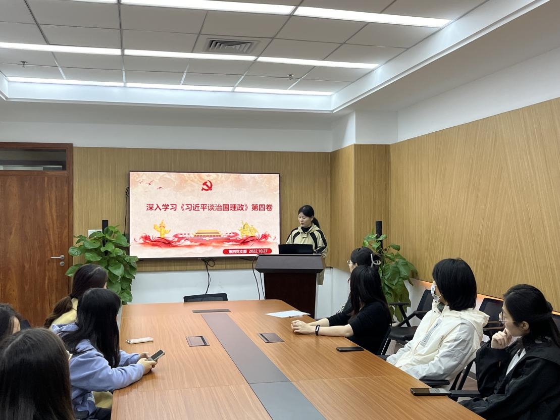 会议第一项,支部党员丁学凤领学《习近平谈治国理政》第四卷。对认真学习研读《习近平谈治国理政》第四卷,能够让我们从理论与实践相统一、历史与现实相贯通、国内与国际相结合上,不断深化对习近平新时代中国特色社会主义思想开辟马克思主义发展新境界、实现马克思主义中国化新飞跃的理解和认识。