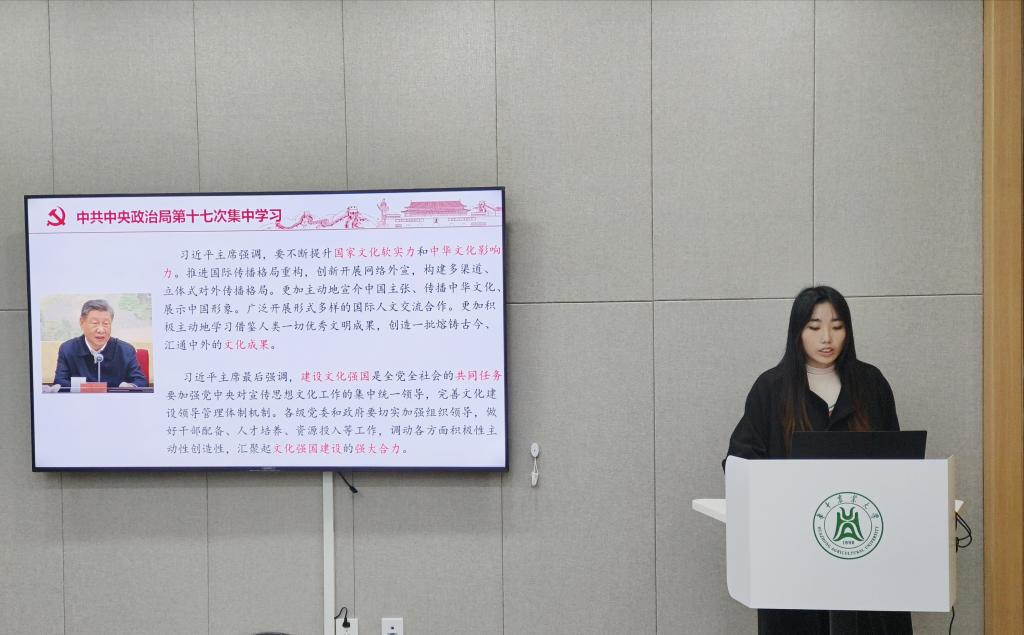 本次活动由研究生第七党支部第二党小组领学。会议伊始,段嘉琪同志带领全体成员深入学习了习近平总书记在中共中央政治局第十七次集体学习时的重要讲话精神。讲话中,习近平总书记指出要着力激发全民族文化创新创造活力,同时强调要不断提升国家文化软实力和中华文化影响力,建设文化强国是全党全社会的共同任务。