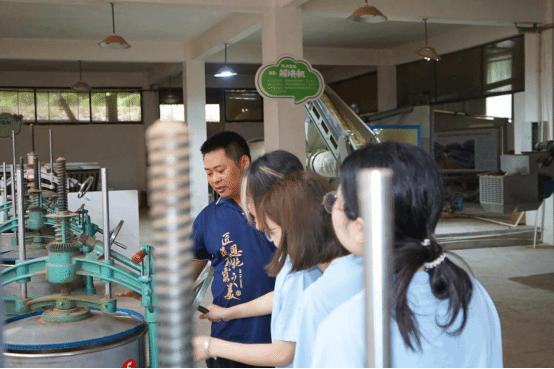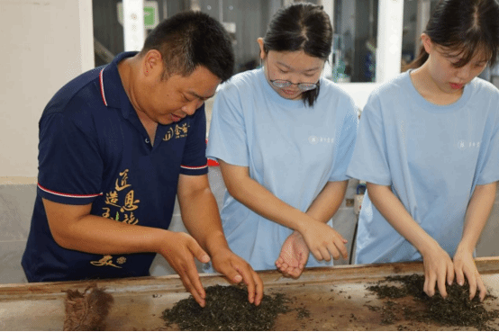 次日清晨,实践继续推进。团队参观茶园管理系统,与茶农一同进行采摘工作,深入了解茶叶种植环节。随后,在制茶车间内,恩施玉露第十代非遗传承人王忠德的弟子、金苔香茶厂负责人金海峰为团队成员讲解了恩施玉露的制作工艺与要点,并邀请同学们体验揉捻过程。同学们按照“搂、端、搓、扎”四步走战略,亲手炒制恩施玉露茶叶,领略非遗技艺的魅力。