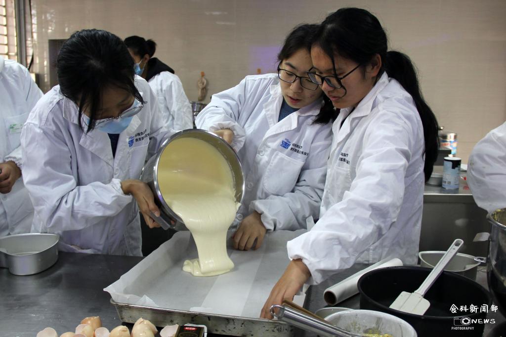 食工类2004班的丁雪爽同学则分享了她的体验与收获。她认为,此过程中最重要的一点是团队协作,原料的配制与机器的使用等步骤都依赖于小组成员间的协调配合,正是在组员的共同努力下,才有了香软可口的海绵蛋糕。