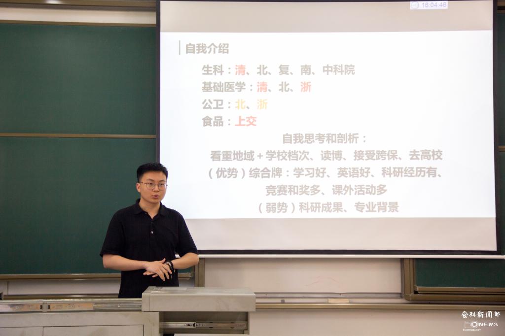 第一位进行分享的是陈昊泽,他首先向大家介绍了保研的基本流程。在谈到保研方向时,他建议大家先进行自我评估,对自己侧重的学校客观条件进行考量,再来选择自己心仪的学校陈昊泽将保研准备的过程比喻为“一场信息搜集战即从目标学校的官网、公众号等平台来获知相关信息针对申请材料的准备阶段,他建议道:“简历一定要简洁,篇幅控制在一页之内,让人一目了然。”面试阶段分为自我介绍、自身科研经历、个人问答、外文文献朗读和翻译四个部分。他表示中、英文和不同时长的介绍都要提前准备好,并提前演练个人问答。对于最后的外文文献的朗读和翻译部分,他建议同学们多积累专业词汇。