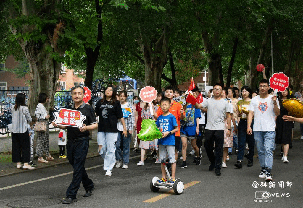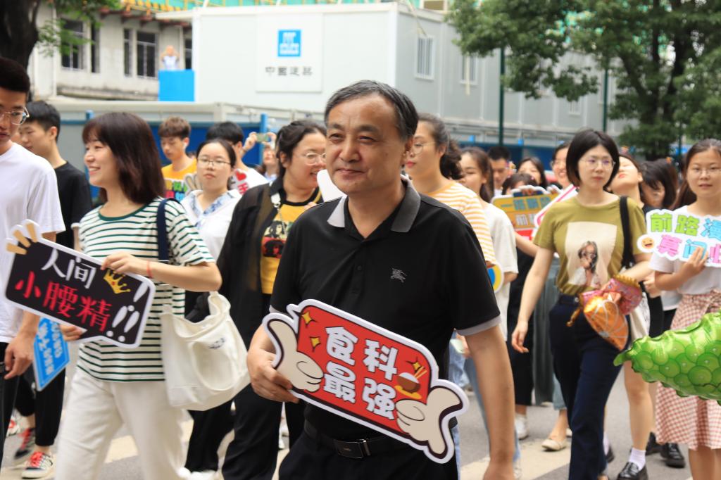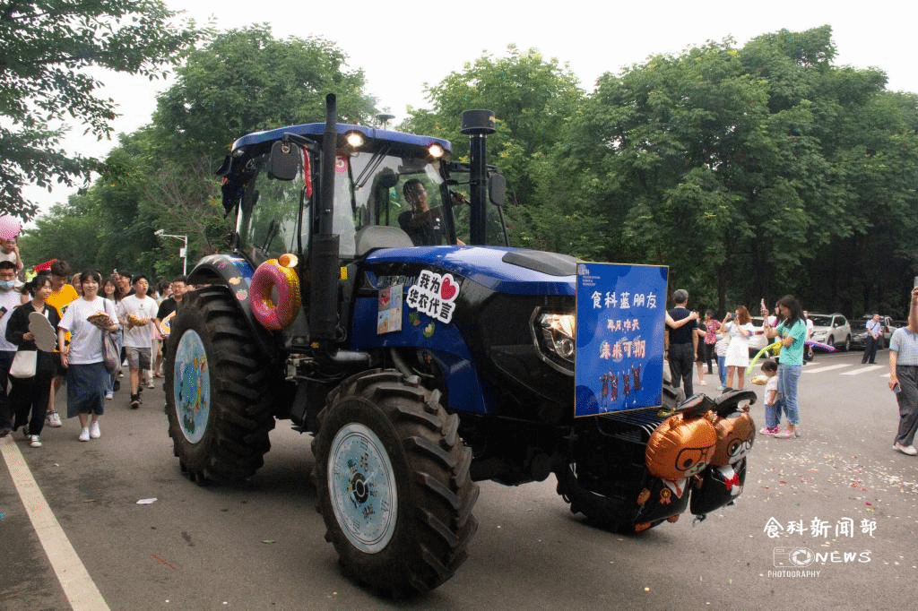 “民以食为天”的特色主题。游行的过程中,杨铁贵书记在最前方引领着大家前行,广大师生挥舞着不同标语的毕业手牌。沿途中也有不少的同学被吸引,纷纷加入队伍参与游行,大家的热情在引擎的轰鸣声和师生的欢呼声中持续高涨。