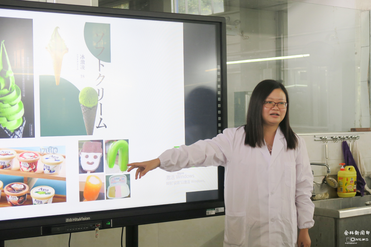 接着,盛老龙师详细讲述了冰淇淋的制作步骤。本次活动制作的是软质冰淇淋,有巧克力、香蕉、抹茶三种口味,分别由六组同学分工制作。在讲解冰淇淋制作的工艺流程时,盛龙老师强调,在处理与配置混合原料时,需注意增稠剂的使用方法,奶油也需加热熔化,搅拌均匀。另外,两位老师都特别强调了制作过程中的安全和卫生问题。