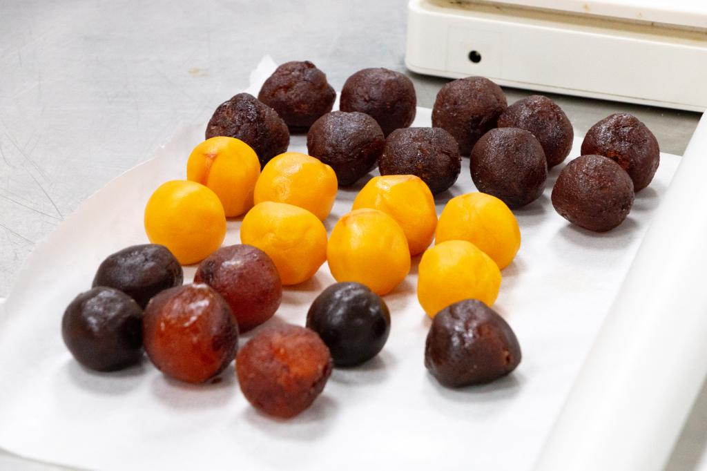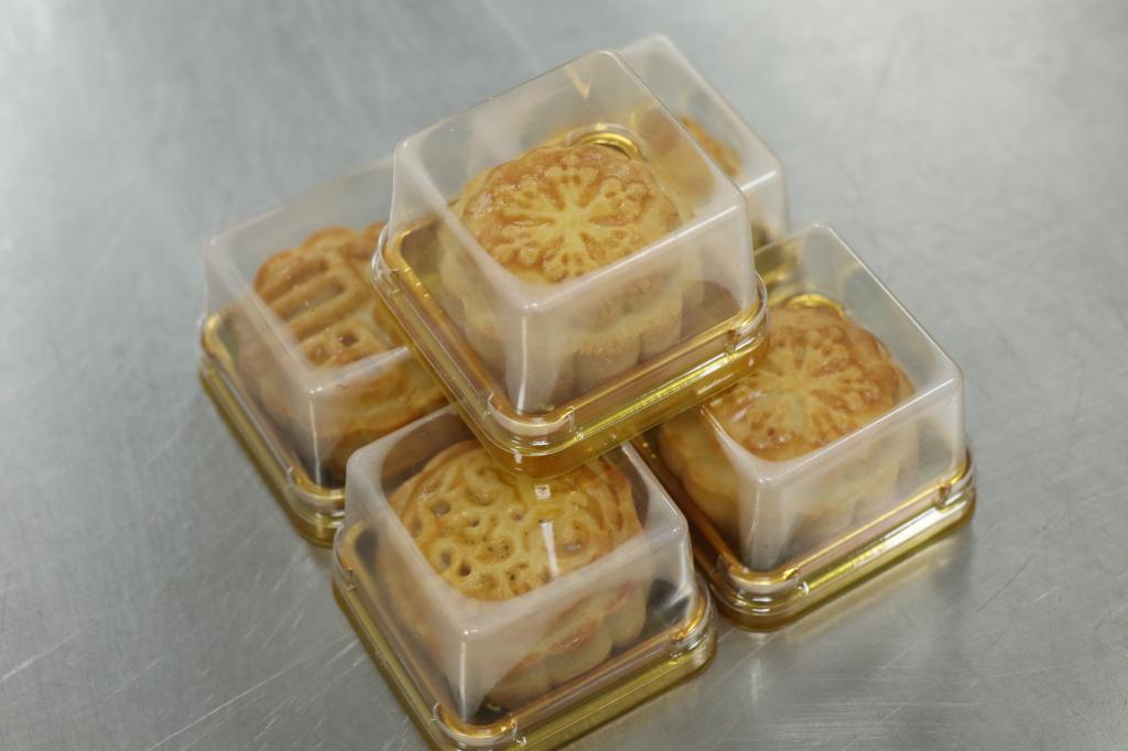 前期工序完成后,大家用已回温的饼皮包裹馅料,再裹上一层面粉,最后放入模具压制。将压好成型的月饼放入烤箱,烤至定型后取出,刷一层蛋液再进行一番烤制,月饼就制作完成了。
