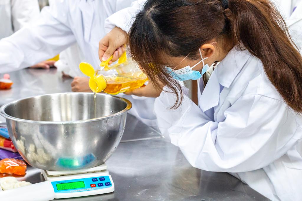 讲解结束后,同学们开始分组行动,每组同学旁边都有志愿者进行详细的指导与帮助。大家先将转化糖浆、碱水和油搅拌均匀,再加入面粉揉成团,和好后做成冰皮,放入冰箱冷藏。