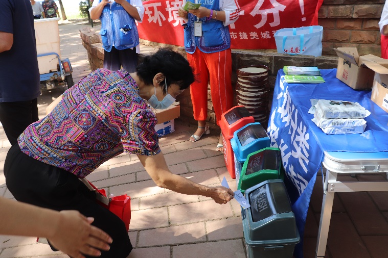 “旧衣服属于哪类垃圾?过期药品、过期化妆品是否属于有害垃圾?”在第一个环节中,食科院青年学生党员们在社区迅速转换身份,当起了社区垃圾分类宣传员,与社区居民开展垃圾分类知识互动问答,并为社区居民讲解垃圾分类的意义。在活动过程中,社区负责宣传垃圾分类的工作人员都被吸引而来加入我们的队伍,并为大家带来了垃圾分类小道具和家庭垃圾分类的小技巧。