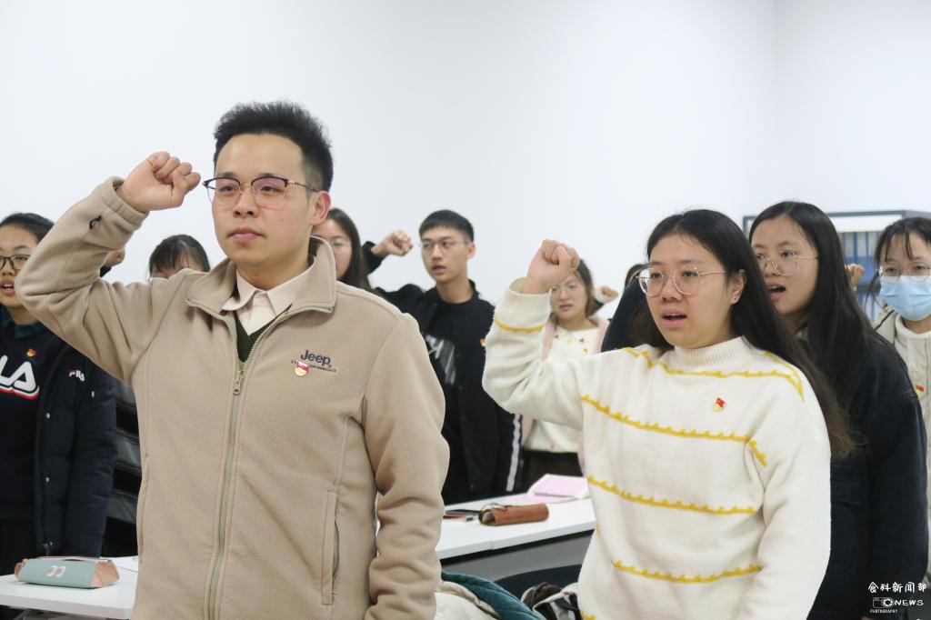 新发展党员入党宣誓仪式暨专题学习贯彻第十九届六中全会精神会议于工科大楼120会议室召开。本次会议由辅导员李虎主持,党委副书记向异之及本学期新发展的33名预备党员到场参会。