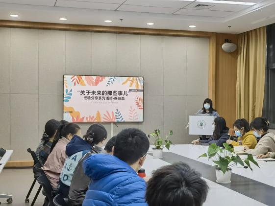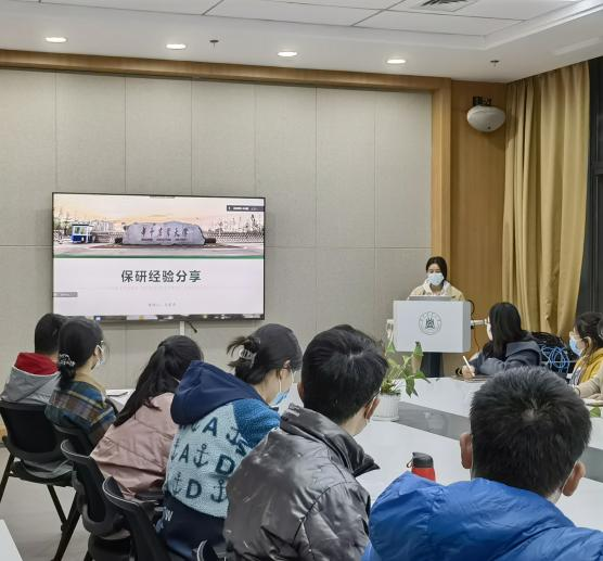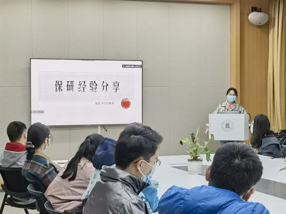 食安1802班邓婉清、食安1804班赵丹杨、食工1802班马雪丹及食工1804班王梦娜四位同学受邀进行保研分享,报名参加线下活动的二十位同学到场参会,学科部负责人戴浩驰主持活动。