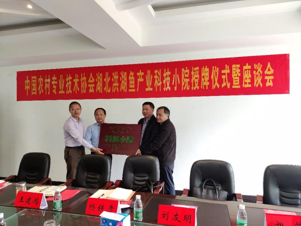 王建鸿和尹恒共同为公司授予“湖北洪湖渔业产业科技小院”牌匾(通讯员刘涵斐摄)