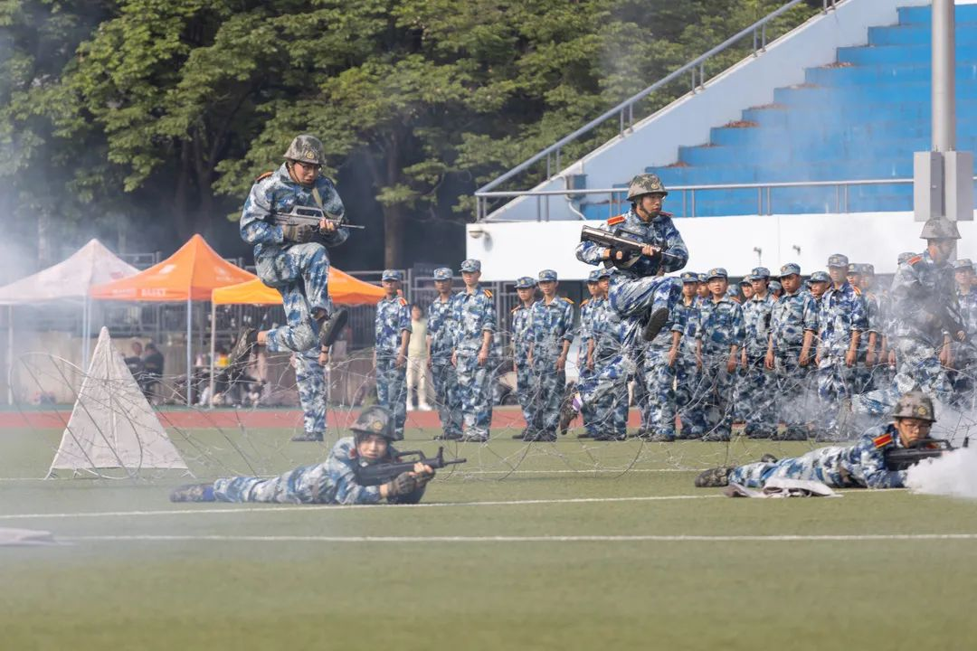 匕首操汇报,400名女生踏步整齐入场。“匕首操,格斗准备!”一声令下,“杀”声响彻全场。460名男生组成的格斗术方阵,出拳踢腿凌厉有力,展现出青年的蓬勃朝气。