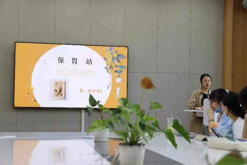 特意邀请了往届获奖学生代表“保胃站——陈皮护胃饼干”团队的冯小芹分享他们创作产品的经验及注意事项,为今年参赛的学生提供理论指导。
