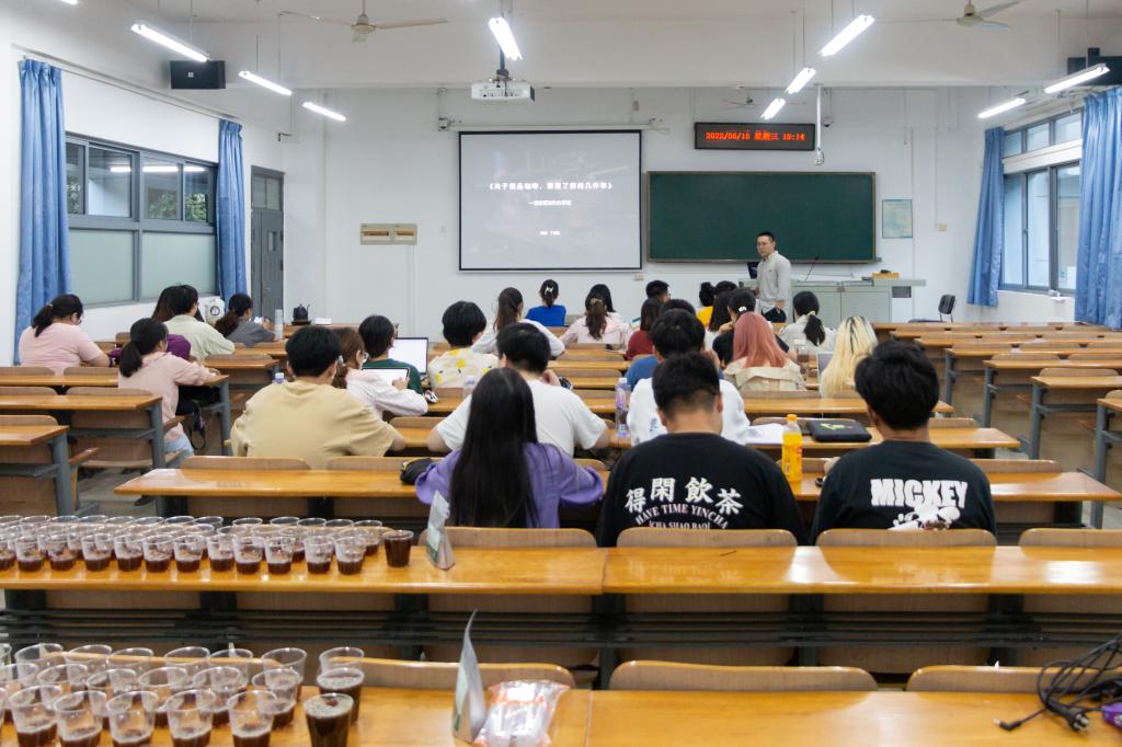 6月15日晚,武汉乔克咖啡商贸有限公司、武汉小霹雳咖啡有限公司、湖北九氪贸易有限公司等公司法定代表人丁哲然应邀在三教C202“饮料工艺学”课上开展主题为“关于精品咖啡,需要了解的几件事”讲座。食工及茶学专业部分学生到场参加。