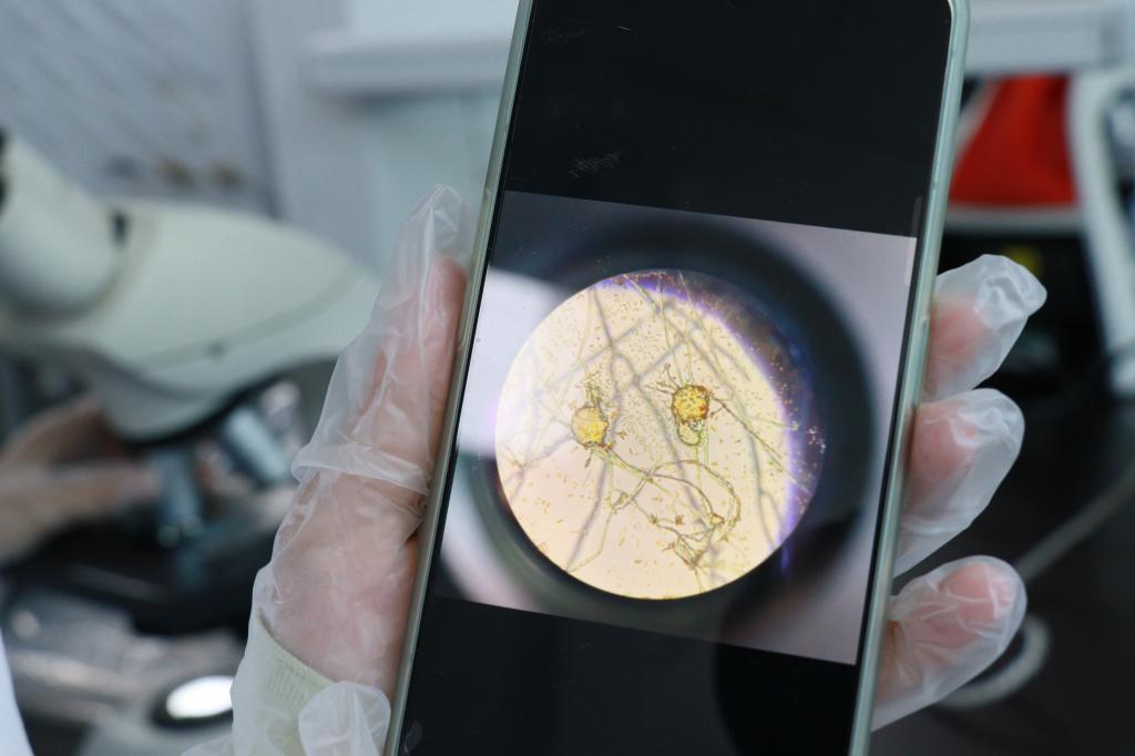 讲解结束后,同学们早已迫不及待地想要体验微观世界真正的乐趣,但大家仍然仔细听取了显微镜的使用方法和注意事项。接着,同学们便开始依照步骤观察显微镜下的微生物。“我看到了毛茸茸的一团!”“我也看到了,它是颗粒状的!”实验室里惊奇和兴奋的声音此起彼伏,大家都兴奋地向周围同学分享着自己的喜悦。但也有同学因为不知道如何调试显微镜而焦急,旁边的小伙伴们纷纷给予帮助,每一位同学都见识到了微生物的奥妙。看到这些微生物后,大家不仅有兴奋惊喜,也有疑惑与不解:“老师,我观察到的是这个微生物的哪个部位呢?”“老师,真菌还能用来做些什么呢?”面对学同学们提出的疑问,邵彦春都一一做出了解答。
