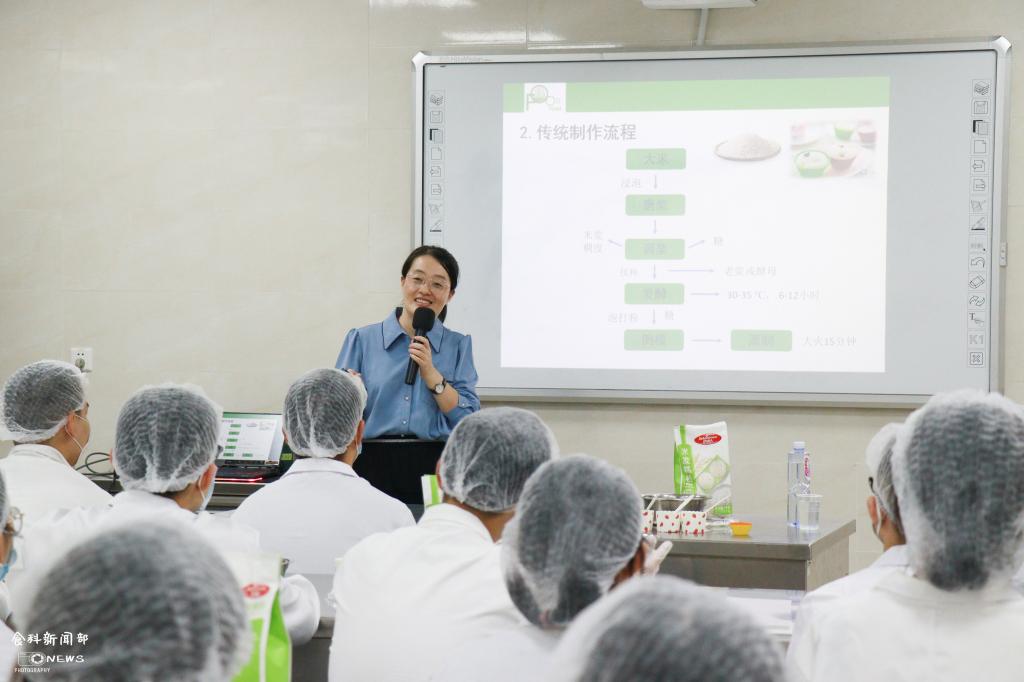 “有多少同学吃过米发糕呢?口感怎么样呢?”活动伊始,许燕首先抛出疑问,鼓励同学们将自己制作的米发糕与市售产品进行对比。随后,许燕从米发糕的历史来源、营养价值、工艺流程等方面进行了介绍。“米发糕寓意着‘福高’,其色泽洁白、绵软甜润、酒香浓郁。米发糕的传统制作流程是将大米浸泡后磨浆,调配至合适的米浆稠度,发酵倒模后蒸制完成,”许燕讲解道,“但传统制作方法存在耗时长,易失败等缺点,因此我们直接使用预拌粉,更方便也更易成功。”