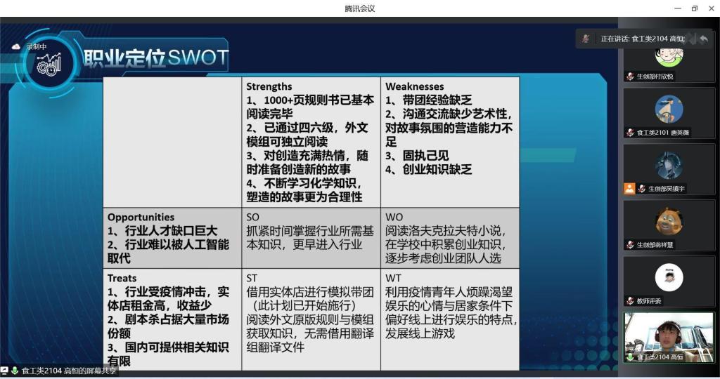 颇令人眼前一亮的是食工类2104班的高恒同学,他通过MBTI职业性格测试以及T12人格分析明确自我定位,确立自己未来的职业发展方向,从行业现状和创业风险两方面的分析来安排职业规划。他对自己的未来充满期待,目标明确且坚定,有明确的自我目的和开展计划,结合专业知识,对未来职业有着充足的了解。