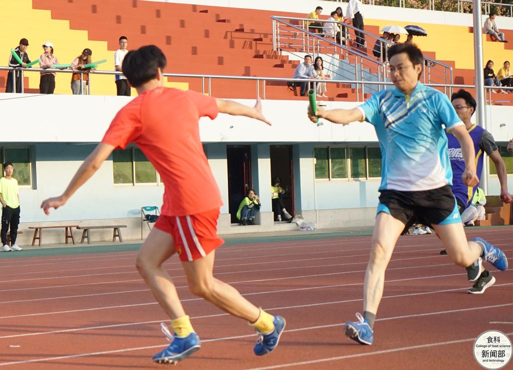 四位教师在充足的准备和赛前最后一轮模拟传棒后,依次走向四个接棒位置,枪鸣之后,第一棒侯焘奋力一迈,在操场上留下一道剪影。随着比赛进行,绿茵场上的欢呼声越来越高涨,作为第四棒,辅导员刘超百米冲刺,最后在小组赛中拔得头筹。