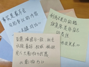 心灵书单,书写治愈力量。同学们用便利贴写下心中“最能治愈心灵的一本书”:“《追风筝的人》教会我宽恕的力量”“《解忧杂货店》让我明白每个烦恼都值得被认真对待”……真挚的文字在墙面上交织成温暖的风景线,随着感悟卡片铺满桌面,书籍与心灵的对话达到动人高潮。