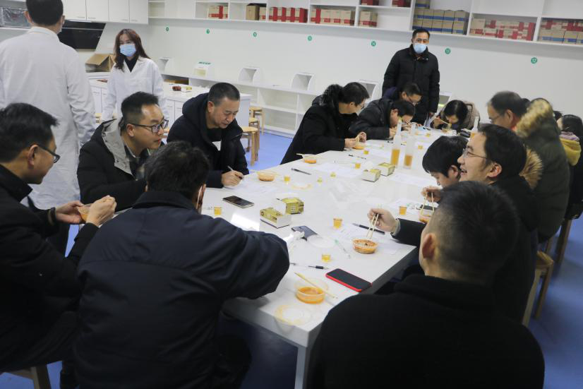 的食品工厂食品品鉴室内,一场妙趣横生的螺蛳粉品鉴会热热闹闹地开展着。