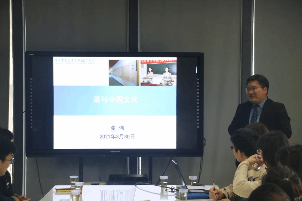 张伟博士就“茶与中国文化”进行了主题分享,全方面阐述了茶的历史源头、分类工艺、功效成分以及人文价值。张博士与现场师生分享了家乡的信阳毛尖,“看茶叶形状、观汤品色泽、品茶味清香”。好的茶叶应该长在“阳崖阴林”,好的茶滋味应该“浓醇甘爽”。