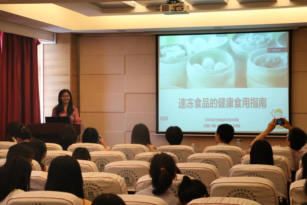 “饺·与君说”队从速冻食品发展趋势和速冻食品在食品工业中的重要地位入手,讲述了速冻新型食品的健康食用指南。该团队介绍了市面上的新型速冻食品,有着零脂零糖、低脂高纤维、含有功能性成分等特点,重点介绍了低脂高纤维食品植物肉、“青稞君”、“魔芋君”三种产品,以套圈游戏、提问互动的形式加深了大家对新型速冻食品的认识。“速冻食品有哪些呢?”“速冻食品后援会”队以翻牌子、观看食品的形式,带大家认识速冻食品,了解速冻食品的消费情况、消费趋势以及人们对速冻食品的误区“速冻食品营养会流失吗?”、“速冻食品应该怎样解冻呢?”、“速冻食品放进冰箱就万事大吉了吗?”针对大家都很好奇的问题,该团队做了一一的科普。“速冻食品的营养基本不会流失,甚至在某些情况下营养甚至更高;速冻食品要根据食物的大小、种类,提前将食物放在冷藏室解冻;速冻食品不宜放太久,最好要在两个月内吃掉。”