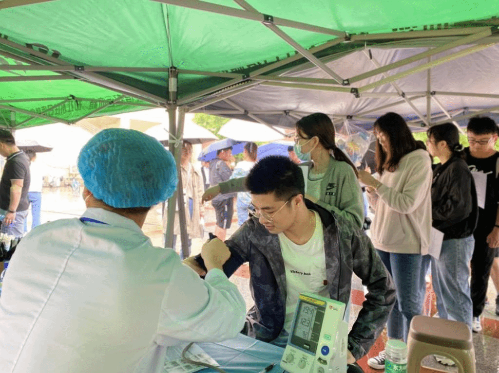 虽然外面下着大雨但是浇不灭同学们献血的热情,大家陆陆续续来到献血车前的帐篷中,开始进行献血前的准备工作。帐篷上的积水时不时倾泻而下,打湿了同学们的衣服,却没有人因为大雨中的等待而放弃。瓢泼的大雨未能阻挡第一党支部的党员志愿者们在雨中来回穿梭,耐心的为每一位献血者讲解献血的步骤和注意事项。