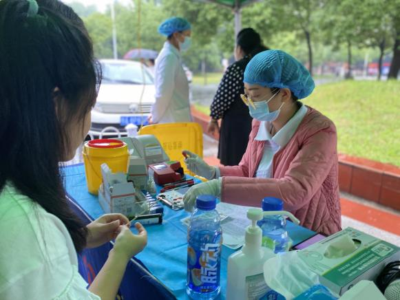 武汉血液中心的医生为同学们仔细地讲解献血的具体流程和第一次献血的注意事项。为了保证献血志愿者的安全,医生们经过严格的献血检查和初筛后才让大家登记排队。看到结伴相约来献血的同学们在帐篷外排起了长队,一位女医生主动加入了党支部志愿者的队伍里,和他们一起维护现场的秩序,引导同学们有序献血。