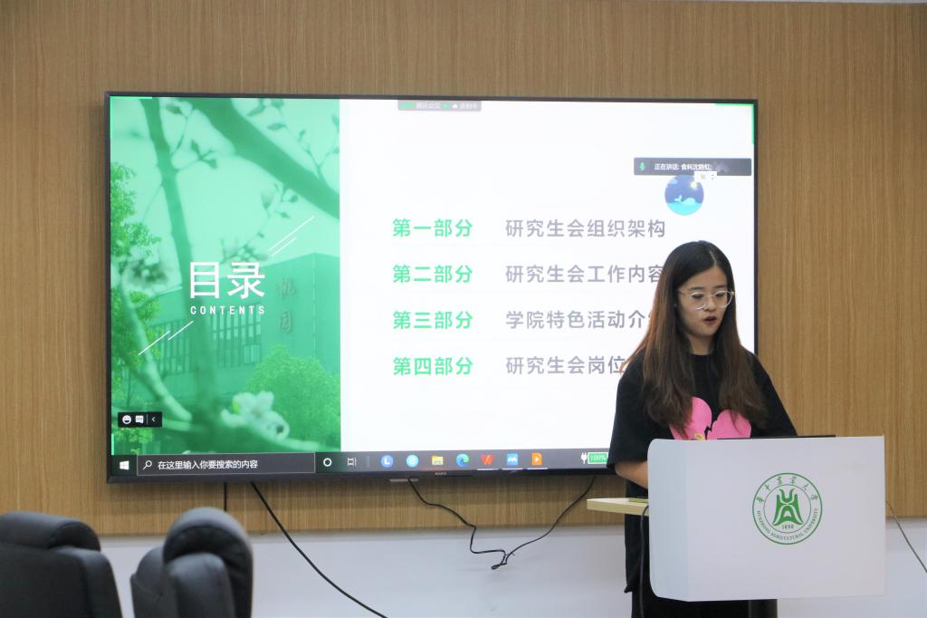 随后,研究生会主席沈路虹为大家介绍了食科院研究生会的组织架构、各部门职责以及研究生会主办的一系列活动,如食品安全与营养中国行、“你的回合”学术力养成计划、科研人的金秋食光等,她分享了食科人的研会故事,并希望更多的同学能够通过德智体美劳多方面的锻炼,提高个人能力,丰富科研生活。