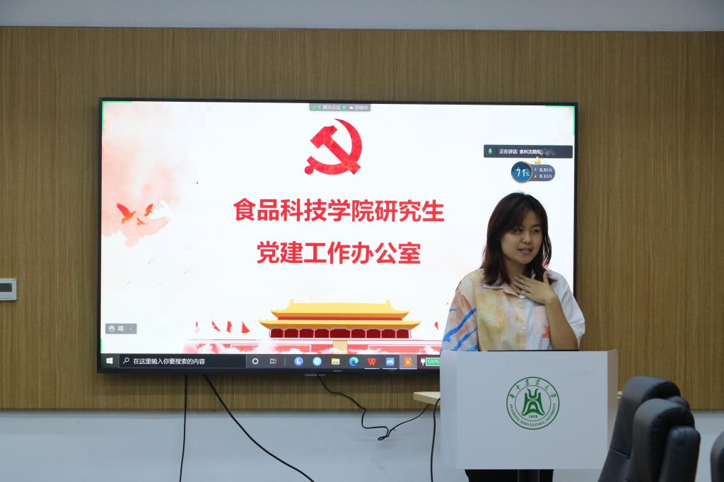 党建活动,如党的理论知识竞赛、党支部立项活动、云端“知·食”讲座等,她表示食科院党建办公室是一个有使命、有情怀、有担当的大家庭,现在正值中国共产党成立100周年之际,希望更多细心、耐心、有良好心态、有责任有担当的同学们积极向党组织靠拢,强化研究生思想政治的引领作用。