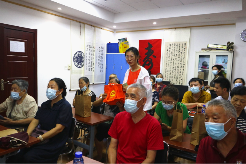 科普讲堂结束后,主持人李琪琪根据讲解的内容与老人们开展互动问答。冰箱里的蔬菜应该如何摆放?常见食品应该如何保存?老人们积极回答,分享自己的生活经验。宣讲结束后,博士团为老人们分发了礼品。