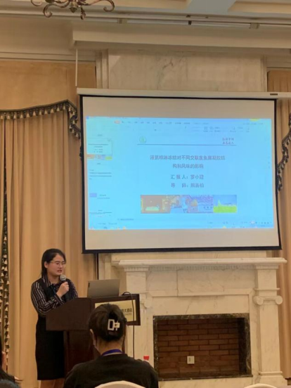 此外,团队研究生温利、李温蓉和罗小迎同学结合自己的科研内容分别就鱼糜凝胶过熟味的鉴定与验证、鱼糜化学组成及鱼糕化温度对鱼糜凝胶过熟味的影响、液氮喷淋冻结对不同交联度鱼糜凝胶结构和风味的影响在会议的研究生论坛作报告。