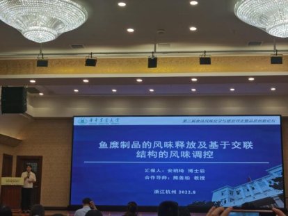 会议由浙江工商大学陈建设教授的主持,中国食协营养委员会常务副会长兼秘书长杜荷致开幕词,来自北京工商大学、江南大学、贵州大学、浙江工业大学、上海应用技术大学、中国农科院、中国标准化研究院、雪景电子科技(上海)有限公司、北京意图科技有限公司等高校和相关企业的29位行业专家做了精彩报告。其中,华中农业大学食品大分子结构与功能特性团队的安玥琦博士后在大会上作题为《鱼糜制品的风味释放及基于交联结构的风味调控》的报告,分享团队近年来围绕鱼糜制品风味分析与调控方面的研究成果,得到了行业专家的认可与好评。