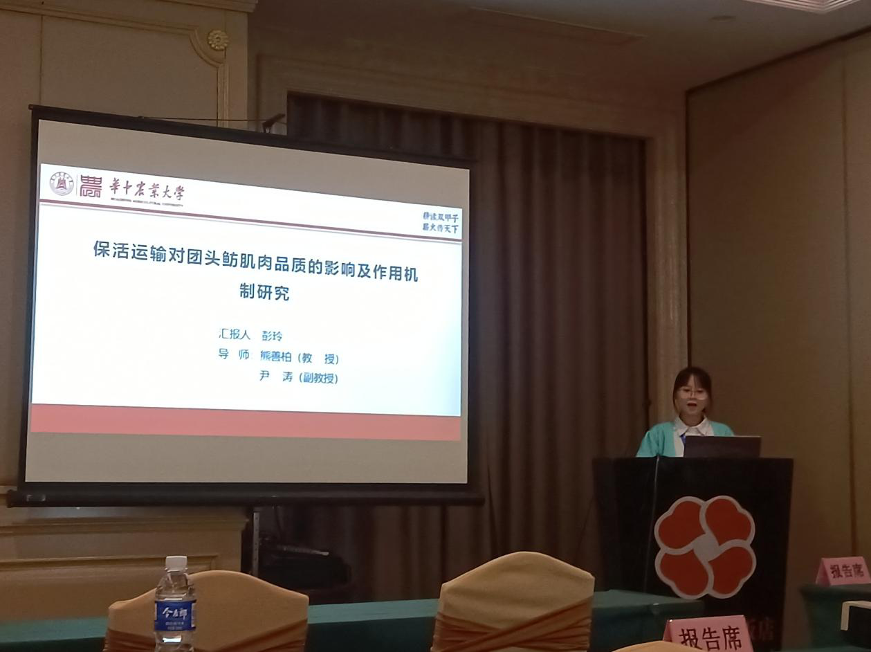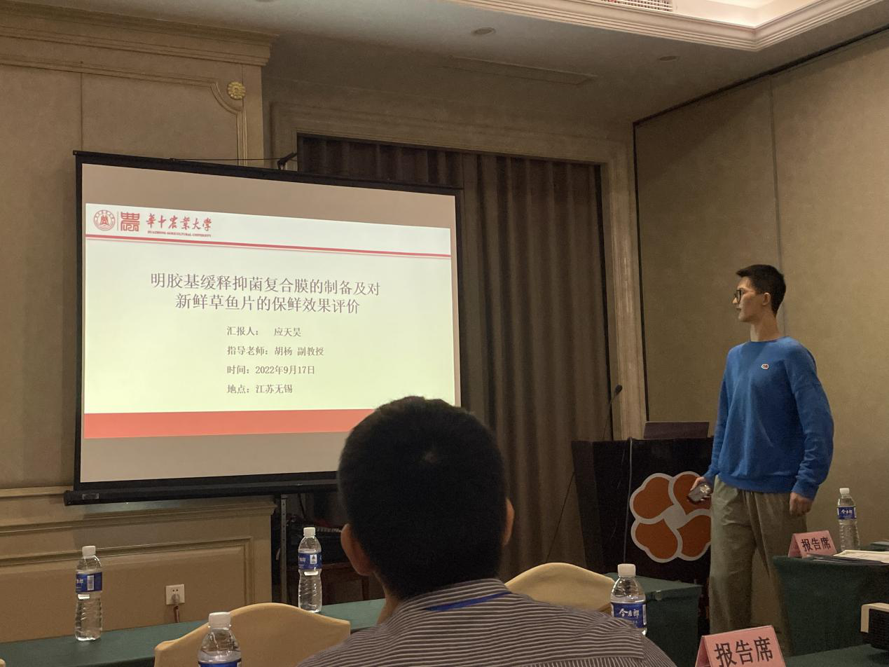 此外,在本次会议的研究生论坛上,团队研究生王宇航、高霞、应天昊、阳胜男、陈浩、彭玲、熊喆同学结合自己的科研内容分别就MTGase 交联对明胶理化性能及体外消化特性的影响、高强度超声处理对不同盐浓度下鲢鱼肌球蛋白理化特性的影响、明胶基缓释抑菌膜的制备及对新鲜草鱼片的保鲜效果、鲢鱼滑工艺配方的优化、中国淡水产品物流现状、问题及发展、保活运输对武昌鱼肌肉品质的影响及作用机制研究、基于超声辅助酶解法制备草鱼鳞胶原肽及其风味解析作了报告。