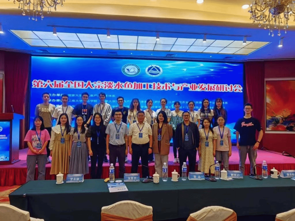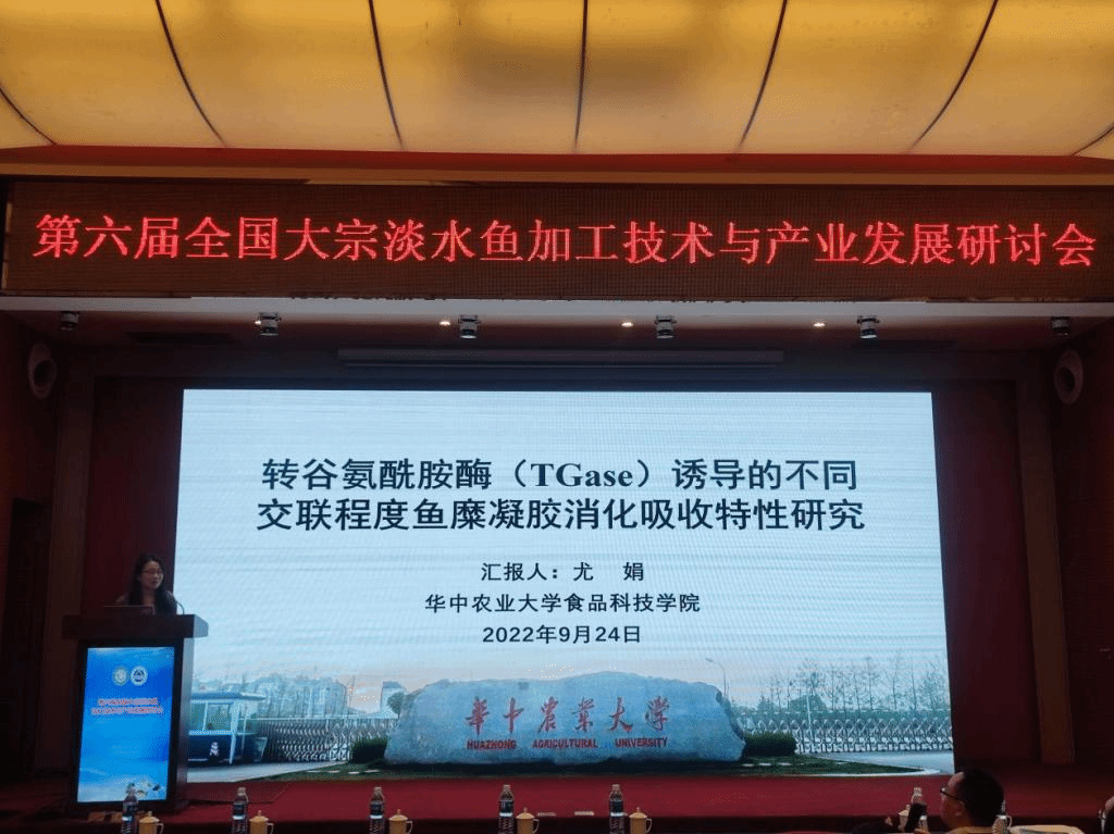 期间,华中农业大学食品大分子结构与功能特性团队的熊善柏教授在大会上作了题为《池塘养殖草鱼的提质、调理加工与保鲜技术》的报告,指出我国淡水品种池塘养殖比例高、加工率低的现状,且淡水鱼产业目前存在的问题在于鲜活销售风险大、产品品质不稳定以及鱼肉土腥味较重,故技术开发思路应集中在净化提质、低温保鲜以及冷链物流三个方面。经过团队的前期努力,实验室建立了微流水净化提质技术、鱼制品调理保鲜技术以及调理鱼增鲜去腥技术。随后,尤娟、尹涛、胡杨、安玥琦分别作了题为《转谷氨酰胺酶TGase诱导的不同交联程度鱼糜凝胶消化吸收特性研究》、《淡水冷冻鱼糜特性及加工技术》、《EGCG/TGase对鱼糜凝胶物性调控的协同增效机制研究》、《风味物质在不同交联度鱼糜制品中的释放与调控》的报告,分享了团队近年来围绕鱼糜及鱼糜制品风味与品质调控的研究进展,得到了与会专家的认可与好评。