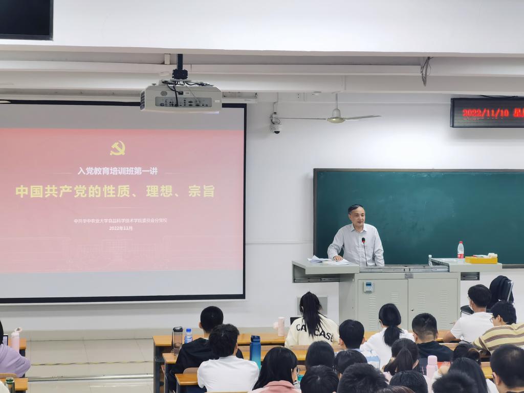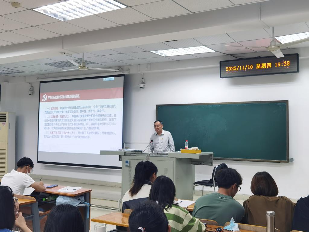 杨铁贵首先跟大家分享了自己对党课的理解,他认为党课有两个根本目标,一是让同学们了解中国共产党的理论构架、最高理想、底层逻辑、性质以及对中国共产党员的要求,同时也要学清楚、弄明白“党是怎么来的”“要干什么”“为什么人”“达成什么目标”等基本问题;二是让大家明白如何成为一名合格的中国共产党员,终身为党和人民奋斗和奉献。他指出,所有同学不仅要在组织上积极向党组织靠拢,更要在思想上入党,了解党的发展历史和底层逻辑,真正理清来龙去脉,端正入党动机。党中央在不同的历史时期对党的性质有着不同的阐述,但都旗帜鲜明地表明:党的最高理想和最终目标是实现共产主义。他向大家强调,中国共产党是中国各个阶级先进代表组合的整体,一名党员作为不同的社会角色都要争做先进、无私奉献。
