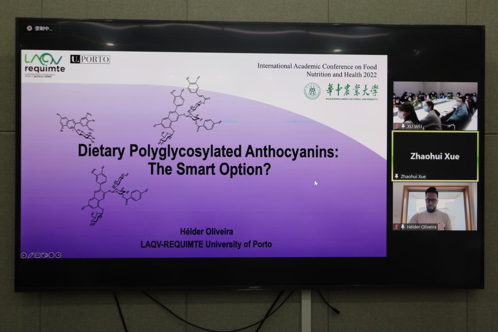 来自法国的Nabil Grimi教授(UTC)向我们介绍了有关脉冲电场技术当前的应用,并展示了此项技术在苹果及甜菜处理中的应用。Helder Oliveira 教授(Porto)对糖基化花青素的成分、结构等进行了汇报。他详细的介绍了PGA提取物的热稳定性及模拟消化抵抗性等因素。接着,何静仁教授(武汉轻工大学)介绍了紫薯花青素-蛋白复合物的抗炎降糖活性的研究。会议最后,Hongshun Yang 教授介绍到了植物性食品中蛋白质与多糖的相互作用对体外消化代谢的影响。